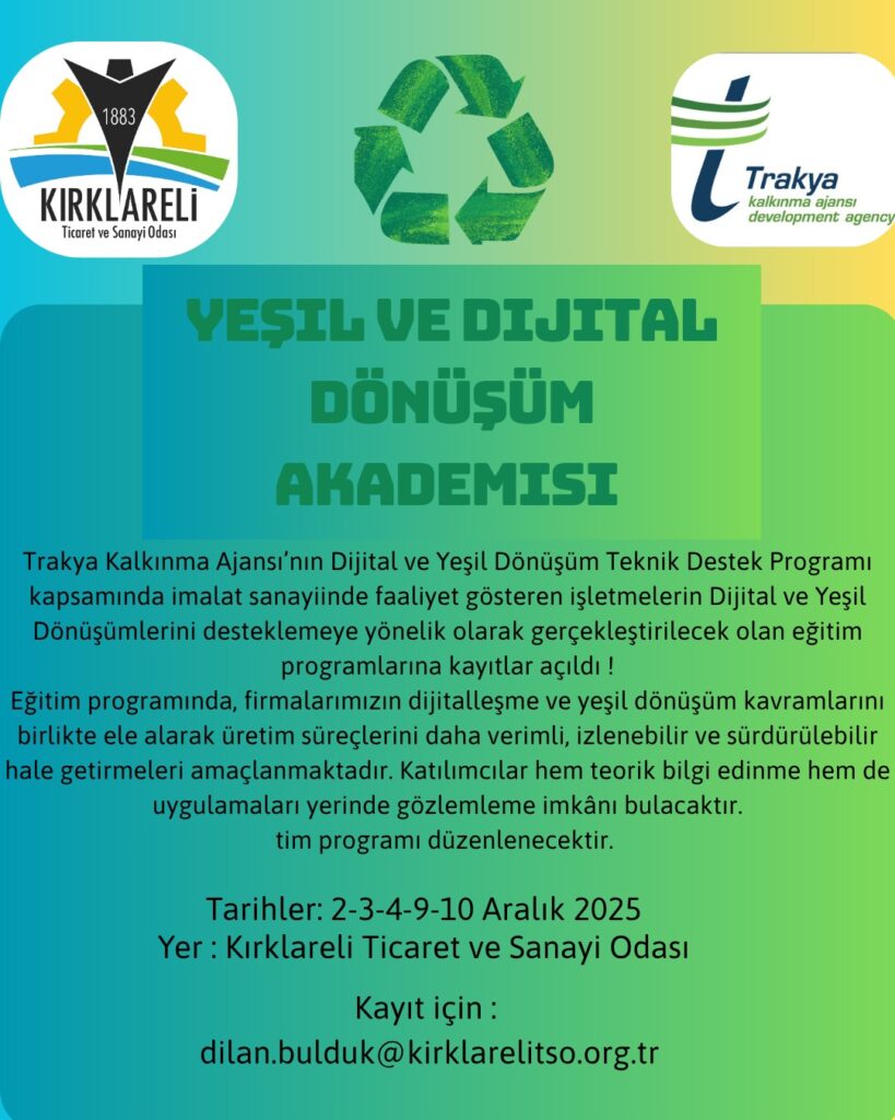 Trakya Kalkınma Ajansı’nın Dijital ve Yeşil Dönüşüm Teknik Destek Programı kapsamında desteklenmeye hak kazanan Yeşil ve Dijital Dönüşüm Akademisi Projemiz ile, imalat sanayiinde faaliyet gösteren işletmelerimizin Dijital ve Yeşil Dönüşümlerini desteklemeye yönelik özel bir eğitim programı düzenlenecektir.