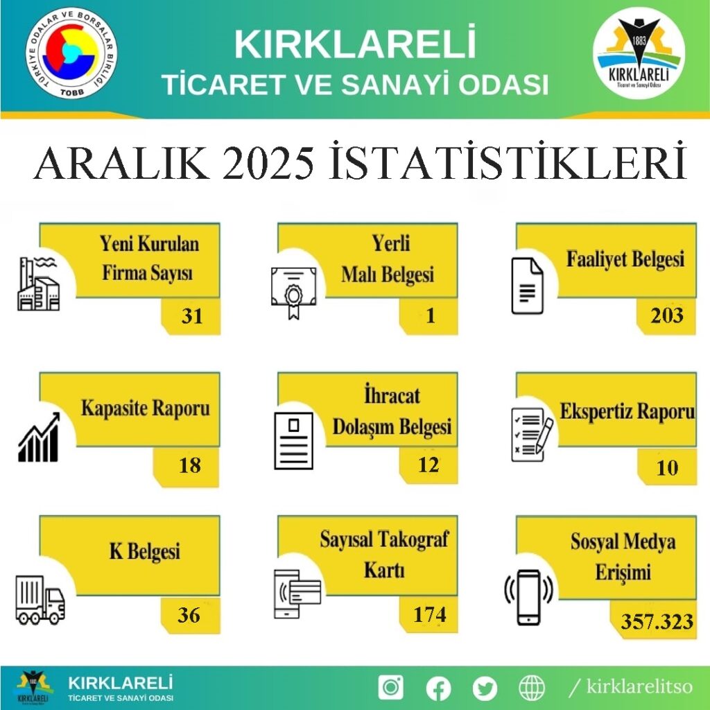 “Aralık ayı içerisinde 31 firmanın kuruluşunu gerçekleştirdik. 1 adet Yerli Malı Belgesi verdik. 203 adet Faaliyet Belgesi hazırladık. 18 adet Kapasite Raporu, 12 adet İhracat Dolaşım Belgesi, 10 adet Ekspertiz Raporu, 36 adet K Belgesi, 174 adet Sayısal Takograf Kartı verdik. Odamıza ait Sosyal Medya Hesaplarımıza Aralık ayı içerisinde toplam 357 bin 323 kişi erişim sağladı.”
