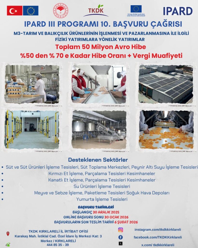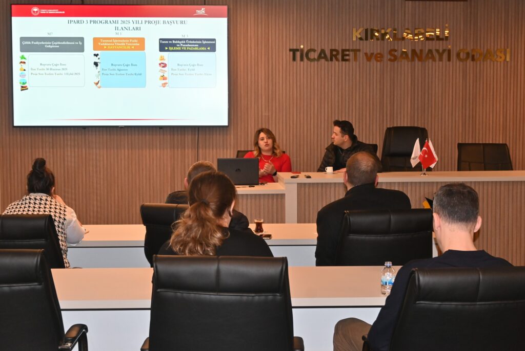 26 Ocak 2026 Pazartesi günü saat 14.00’te Meclis Salonumuzda düzenlenen toplantıda; Tarım ve Kırsal Kalkınmayı Destekleme Kurumu Kırklareli İl İrtibat Ofisi Uzmanları Hatice Yıldız ile Furkan Coşkun tarafından katılımcılara “Program Kapsamında %50–%70 oranında Hibe Desteği ve Vergi Muafiyeti Fırsatları” ile “Süt, Et, Su Ürünleri, Meyve-Sebze ve Yumurta İşleme Tesislerine Yönelik Yatırımlar” hakkında bilgiler verildi. Katılımcılar tarafından sorulan soruların cevaplandırılması ile toplantı sona erdi.