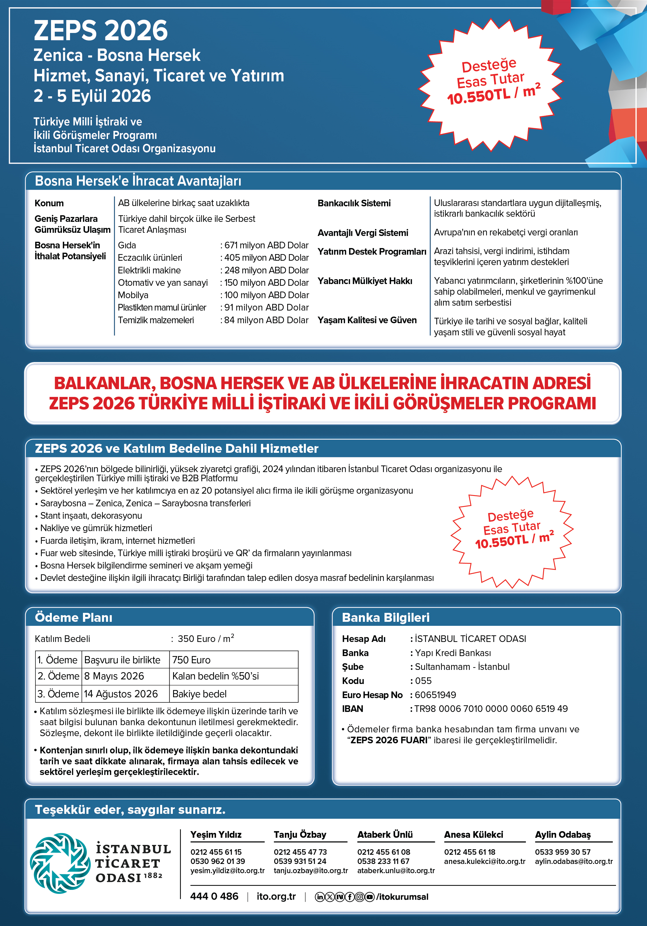 Bosna Hersek’in sanayi merkezlerinden Zenica’da 30 yılı aşkın süredir düzenlenen ZEPS Fuarı, Türkiye milli iştiraki ve ikili görüşmeler organizasyonu 2024 yılından itibaren İstanbul Ticaret Odası tarafından düzenlenmektedir.